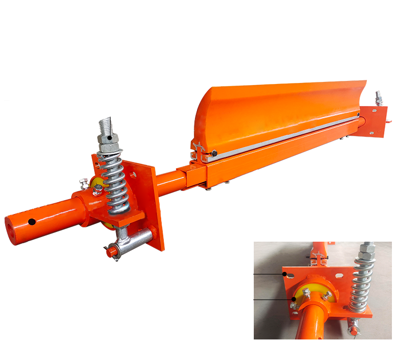 适用于带式输送机卸料滚筒处高速皮带表面残留物料的清扫,解决残留物料在输送机回程段洒落造成的环境污染和残留物料粘黏在托辊上引起的回程皮带跑偏的问题。
